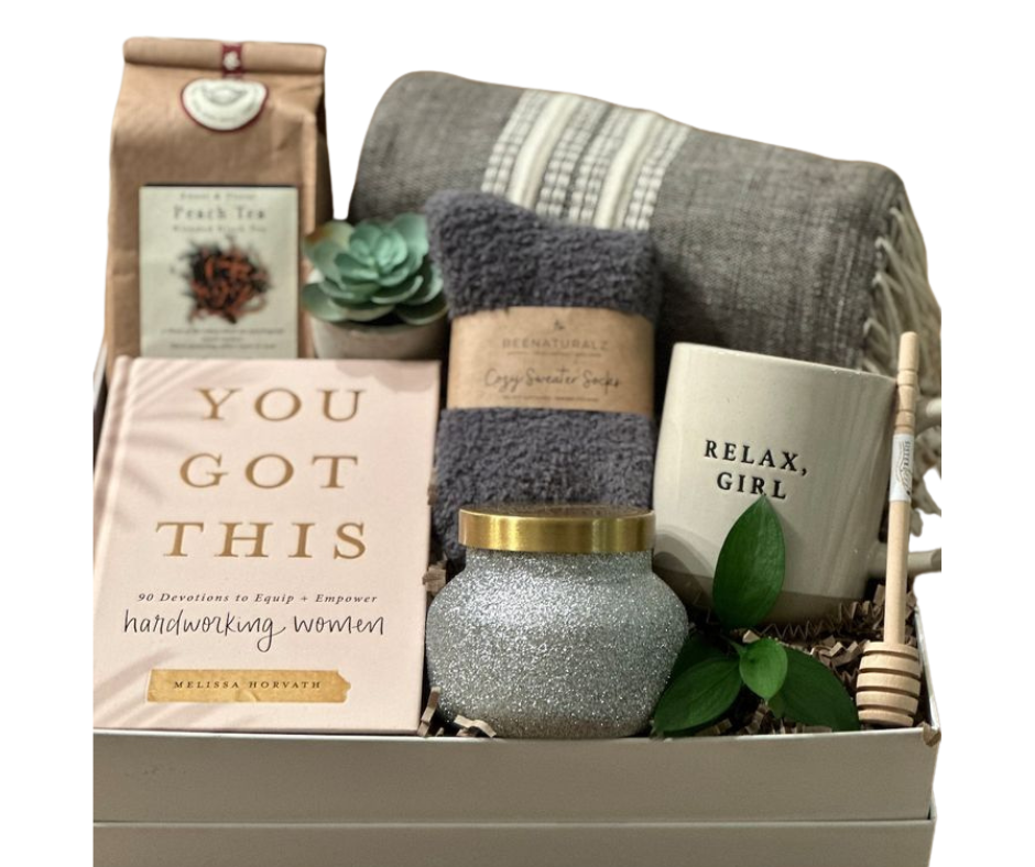 Put in some cozy socks, a cup, a nice smelling candle, face masks, a blanket, a journal, maybe a book, some lotions and some tasty treats.